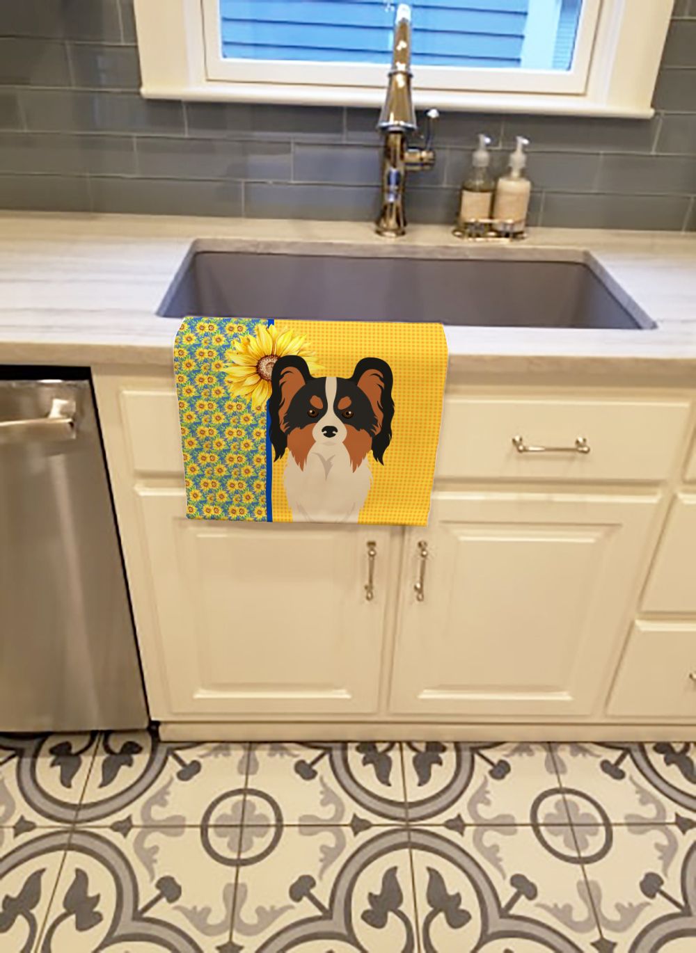 Kitchen Towel featuring breed specific Papillon artwork. Add this colorful Kitchen Towel to decorate for Summer, This Kitchen Towel is from Caroline's Treasures collection Summer Sunflowers. Experience the perfect blend of aesthetic appeal and functional excellence with our Plush Velour Kitchen Towels. These are not your ordinary decorative kitchen towels that gather dust. Instead, they are designed to be as practical as they are stylish. The front layer of our towel is constructed from a minky plush polyester, known for its durability and color retention. Unlike conventional kitchen towels, the artwork on our towels is dyed directly into the fabric, ensuring vibrant colors that last. Polish your glassware to a brilliant sparkle using the plush front side of the towel. Flip to the back, crafted from 100% cotton terry loop, to exploit its exceptional absorbency for drying dishes or wiping down counters. Our kitchen towels redefine the concept of functional art, offering lasting quality that maintains the towel's shape over time. Measuring 15 inches by 25 inches and weighing 2.3 lbs per dozen, these towels deliver an overwhelming sensory experience with their soft, plush, and smooth texture. The edges are meticulously finished with binding, enhancing their durability and visual appeal. For your convenience, these towels are machine washable and can be dried on low heat. After the first wash, the top fabric becomes even softer and fluffier, eliminating the need for ironing. Treat your kitchen to the luxury and functionality it deserves with our plush velour kitchen towels. This Kitchen Towel is from Caroline's Treasures Dogs category of products.