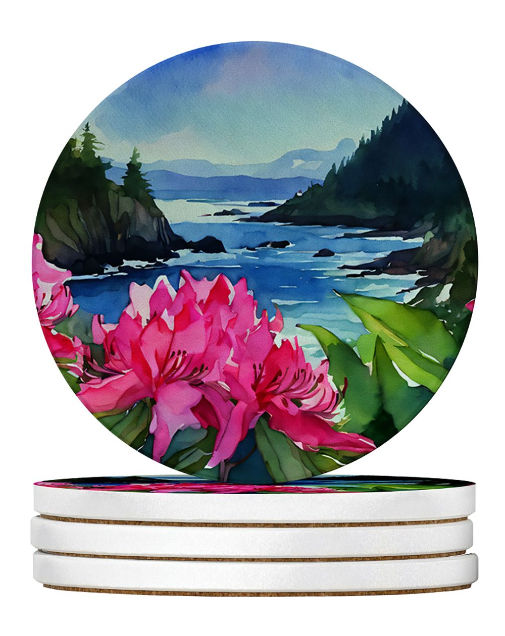 Washington Coast Rhododendrons in Watercolor Large Sandstone Coasters Pack of 4 Absorbent Round Coasters Decor Gifts for Men or Women, 4 in