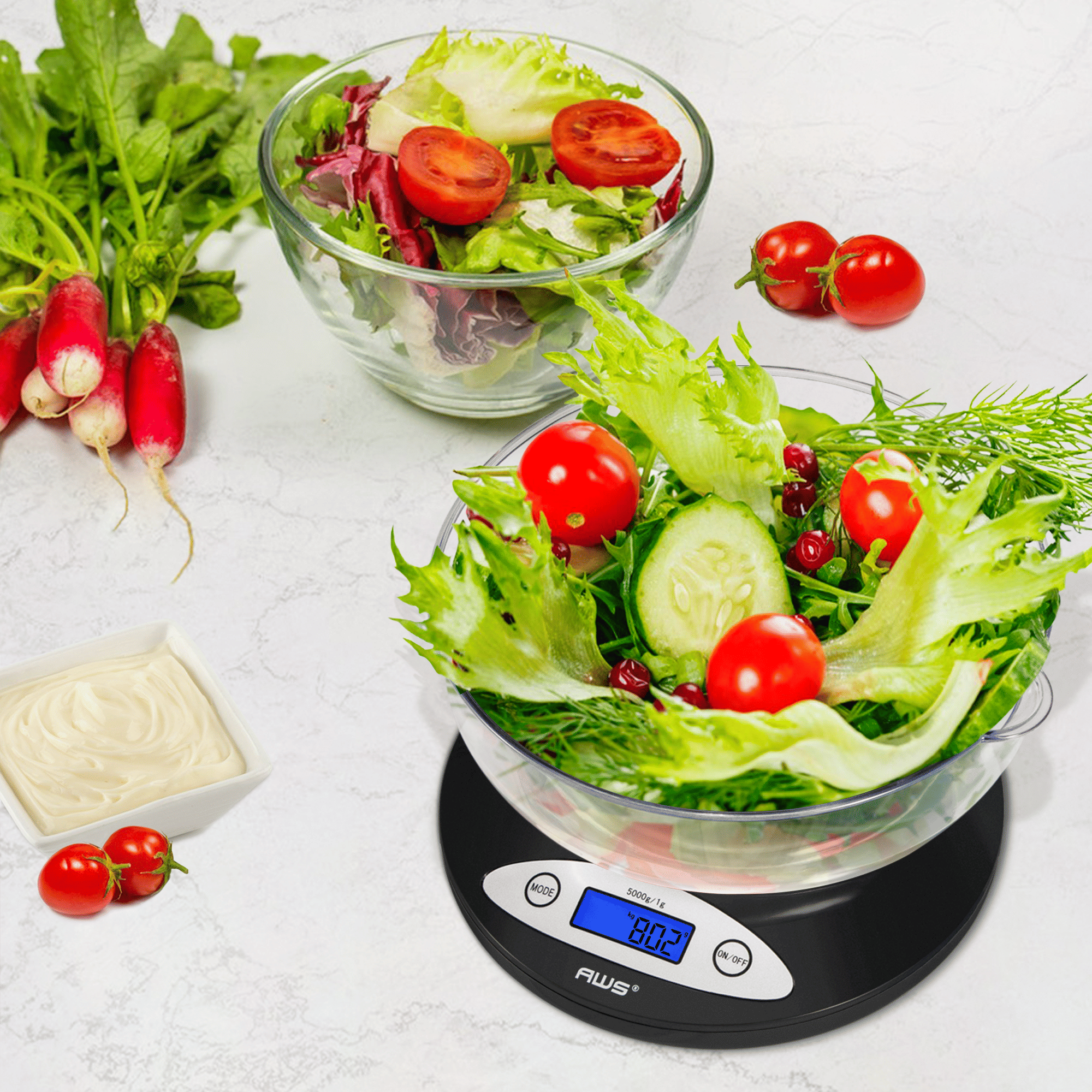 The AWS-5KBOWL makes the perfect kitchen companion. Its durable and user friendly design makes everyday kitchen measuring quick and very easy. The backlit LCD display helps make the numbers viewable and easy to read. This scale offers diversity with functionality. Use the bowl to weigh your ingredients or remove the bowl and place your items directly on the weighing surface. Need more surface? Take it one more step further. Using the tare feature will give you that extra control to use a larger flat surface for additional weighing surface. Clean up is easy and a snap; the sturdy and durable bowl is dishwasher safe. Want grams or pounds? Change modes with a click of a switch. For functionality and reliability the AWS-5KBOWL is the perfect kitchen pal that gets the job done!
