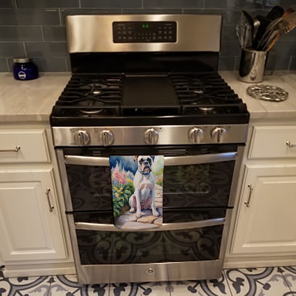 Kitchen Towel featuring breed specific Boxer artwork. Experience the perfect blend of aesthetic appeal and functional excellence with our Plush Velour Kitchen Towels. These are not your ordinary decorative kitchen towels that gather dust. Instead, they are designed to be as practical as they are stylish. The front layer of our towel is constructed from a minky plush polyester, known for its durability and color retention. Unlike conventional kitchen towels, the artwork on our towels is dyed directly into the fabric, ensuring vibrant colors that last. Polish your glassware to a brilliant sparkle using the plush front side of the towel. Flip to the back, crafted from 100% cotton terry loop, to exploit its exceptional absorbency for drying dishes or wiping down counters. Our kitchen towels redefine the concept of functional art, offering lasting quality that maintains the towel's shape over time. Measuring 15 inches by 25 inches and weighing 2.3 lbs per dozen, these towels deliver an overwhelming sensory experience with their soft, plush, and smooth texture. The edges are meticulously finished with binding, enhancing their durability and visual appeal. For your convenience, these towels are machine washable and can be dried on low heat. After the first wash, the top fabric becomes even softer and fluffier, eliminating the need for ironing. Treat your kitchen to the luxury and functionality it deserves with our plush velour kitchen towels.
