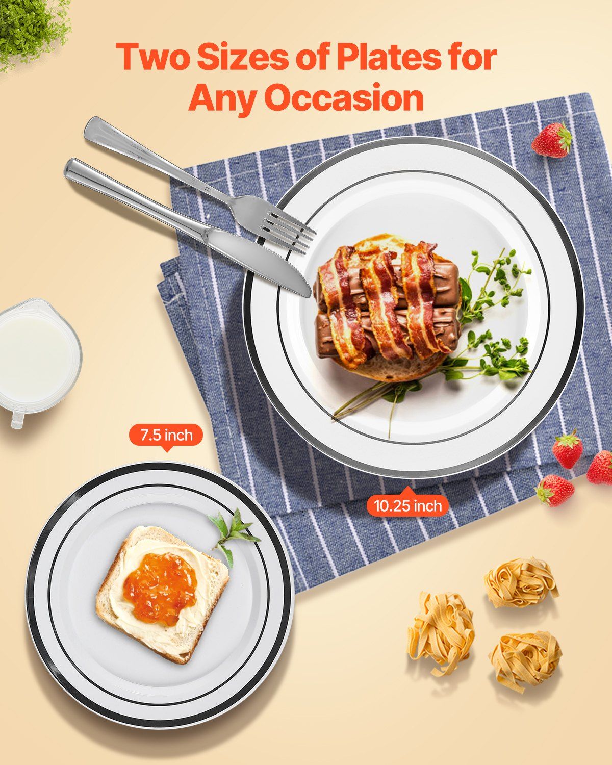 1.Value Pack: This plastic plates set includes 50 dinner plates, 50 dessert plates, 50 pre-rolled napkins with forks, knives, and spoons, and 50 cups, serving up to 50 people at once. It is ideal for large gatherings and celebrations