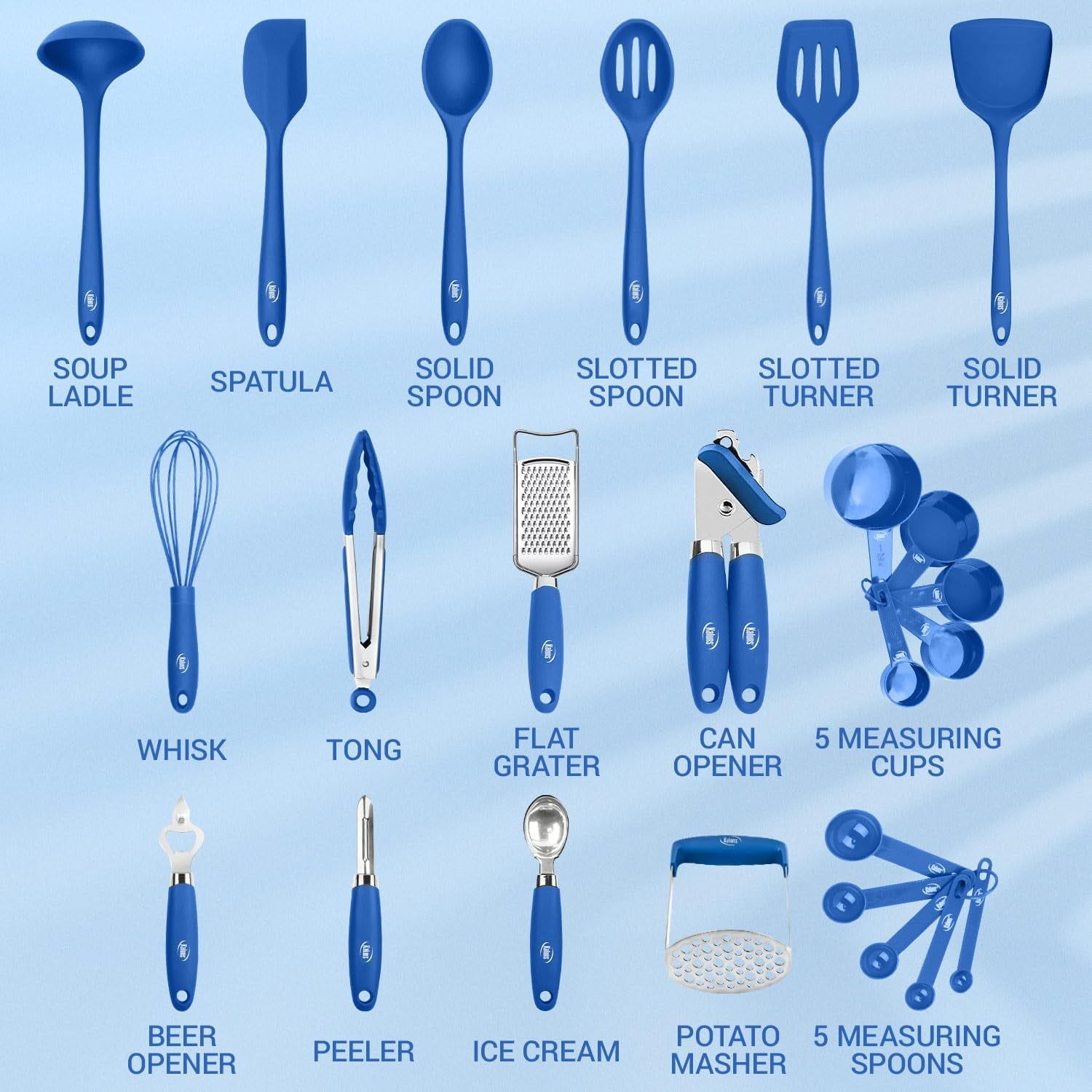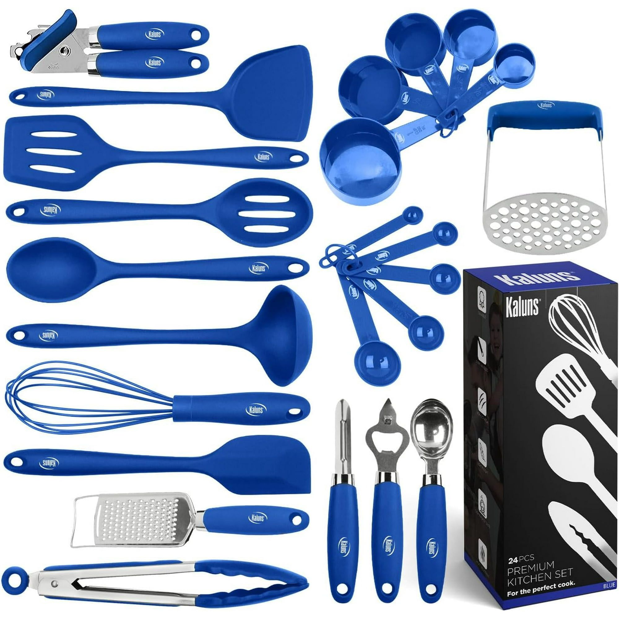Introducing your new favorite set of kitchen gadgets! This 24-piece silicone cooking utensils set has a can opener, turner, slotted turner, spoon, slotted spoon, ladle, whisk, spatula, grater, tongs, measuring cups, measuring spoons, potato masher, ice cream scoop, wine opener, apple corer. It’s all the essential kitchen gadgets you need to cook like a pro!
