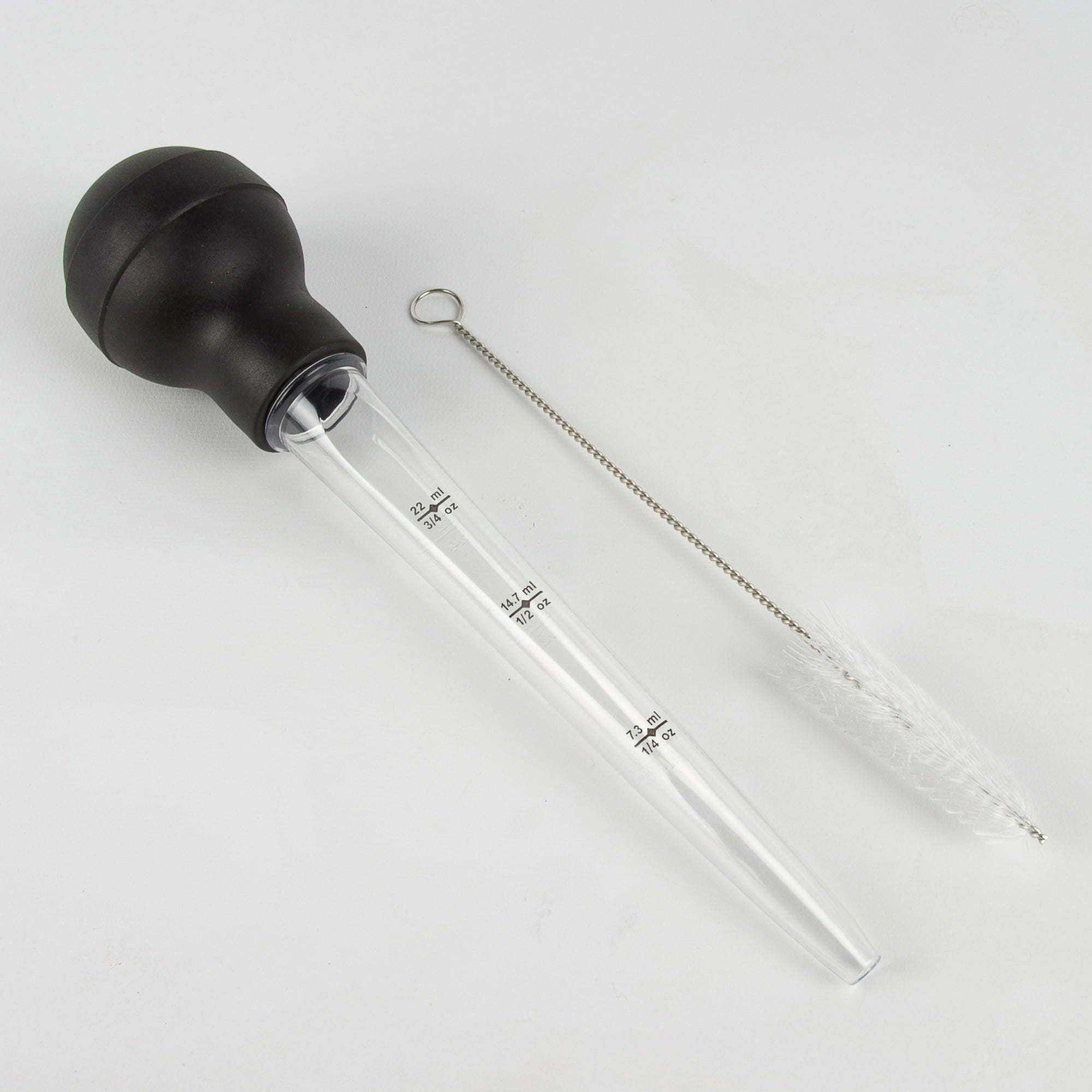 Basting isn't just for Thanksgiving turkey. Enhance the flavor of all your favorite meat dishes with the Baster with Brush. The tight seal of the baster's bulb makes for powerful suction. Retrieve melted butter, marinade, stock or other sauces. With the dual measurement marks on the tube, you won't waste any sauce. After sauce retrieval, drip juices onto your meats to intensify the taste of the skin during the prep process. Cleanup is easy with a removable bulb and an included cleaning brush. From prep to cleanup, the Baster with Brush makes basting efficient and easy. Made from nylon, SAN, TPR and steel. Volume 1 ounce.