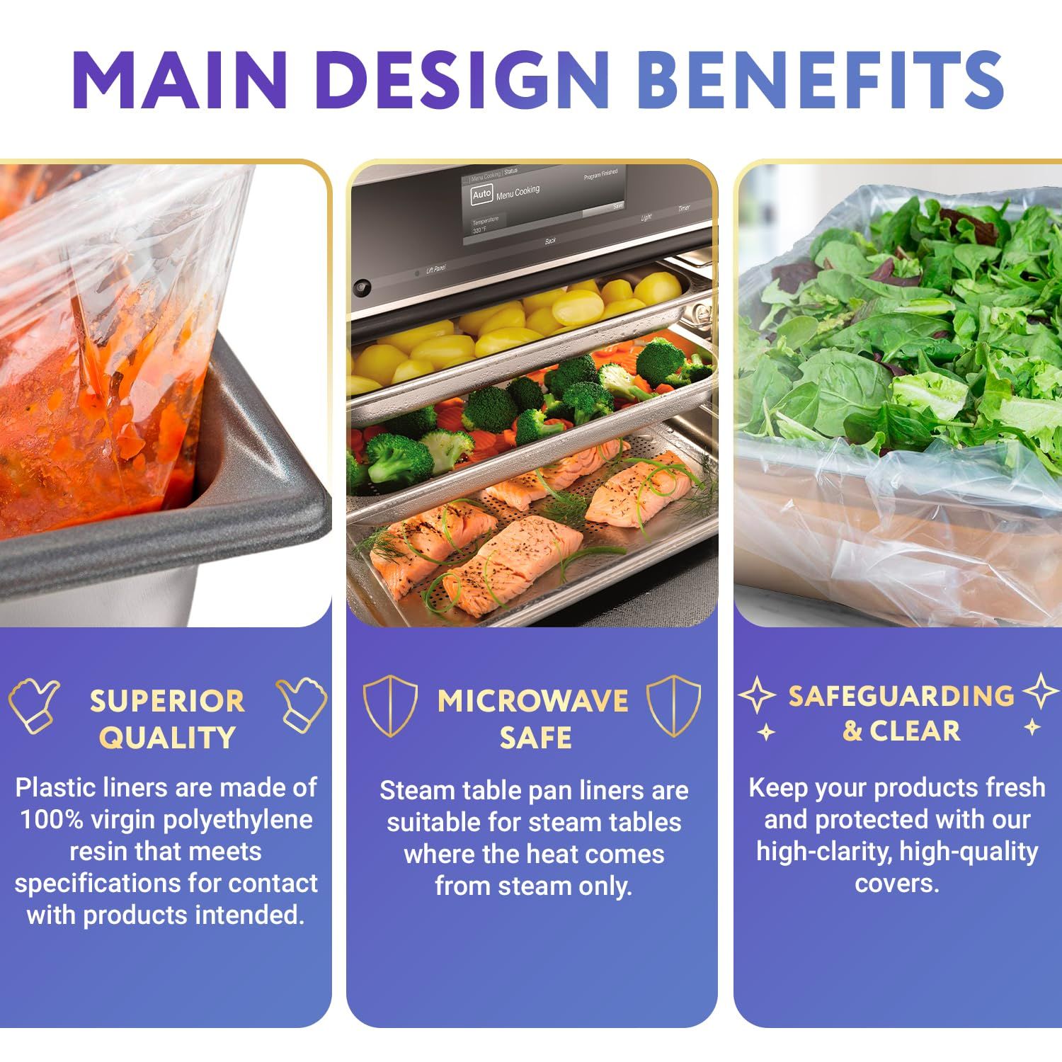 3.MICROWAVE SAFE: Steam table pan liners are suitable for steam tables where the heat comes from steam only. Liners are not ideal for direct contact with heat or direct flame, conventional over, or cookers.