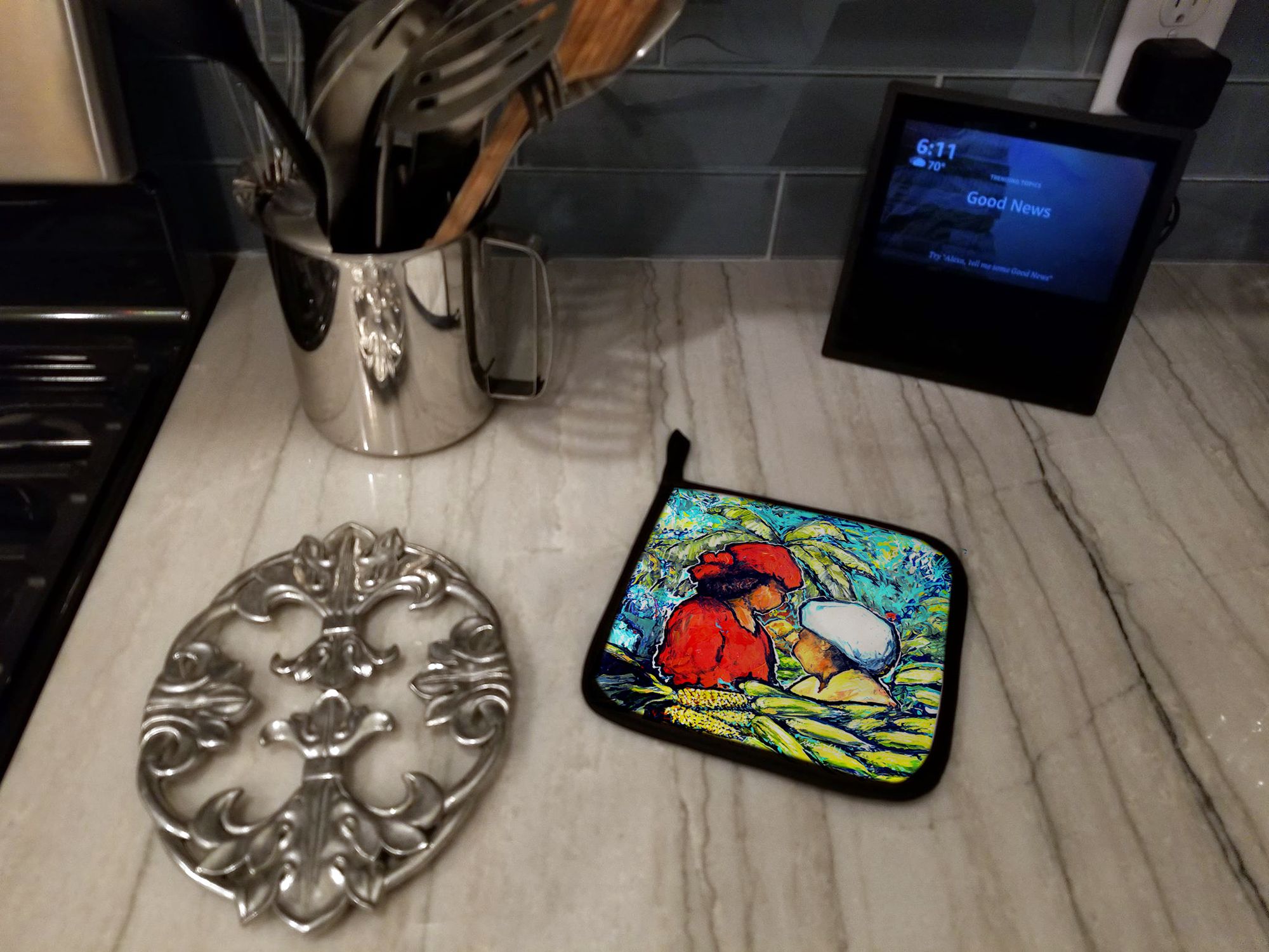 A Pair of Pot Holders to match your kitchen decor. Made in the USA these are thick and functional. Full color artwork decorates the front polyester fabric of the hot pad and accented by a black trim. Use these at as a trivet for your Thanksgiving or Christmas tablescape. Filled with insulated fabric and quilted for durability. These colorful pot holders will make a great gift for your favorite home cook or executive chef. Each pot holder measures approximately 7 1/2 inches by 7 1/2 inches. A hanging tab is included.
