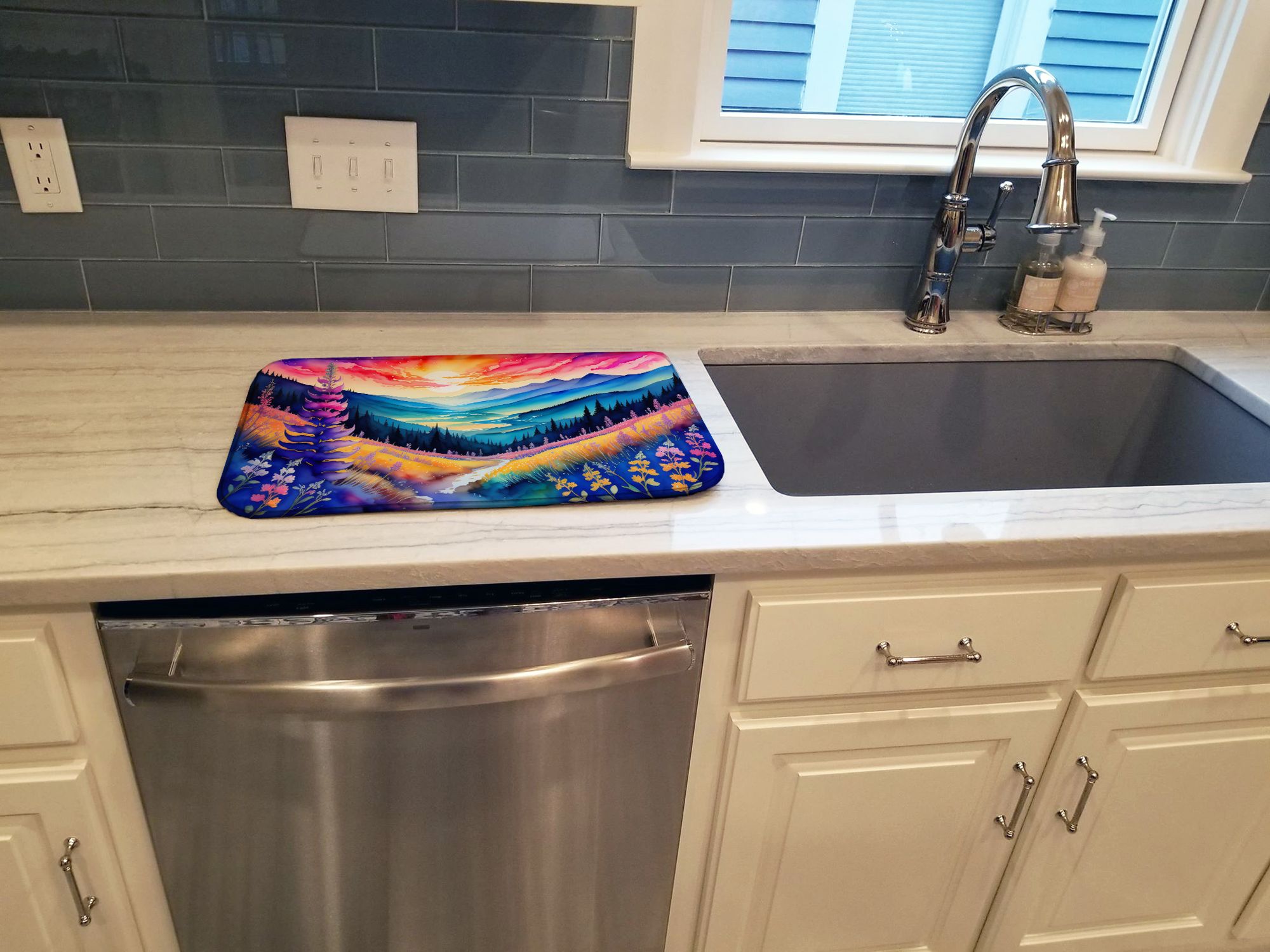 Say goodbye to messy countertops and soggy dish towels with our innovative dish drying mat. Our high-quality dish drying pad is designed to keep your countertops dry while offering a stylish and efficient solution. Whether you're air drying dishes, glasses, stemware, silverware, pots, pans, bottles, or even fruits and vegetables, our dish mat is the perfect choice. The 14 inches x 22 inches size fits most counters and dish drying racks, and the non-slip design ensures stability. Made with water-absorbent polyester and a polyurethane foam insert, our dish drying mat is not only functional but also durable. It's machine washable and printed in the USA for long-lasting use. The beautiful artwork adds flair to your kitchen decor, making it a perfect housewarming gift or present for any occasion. Upgrade your kitchen experience with our absorbent and versatile dish drying mat.
