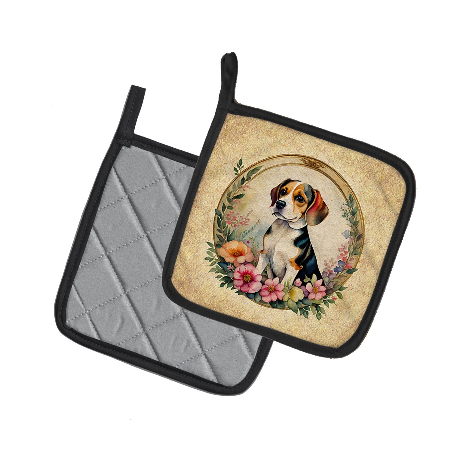Beagle and Flowers Pair of Pot Holders Kitchen Heat Resistant Pot Holders Sets Oven Hot Pads for Cooking Baking BBQ, 7 1/2 x 7 1/2