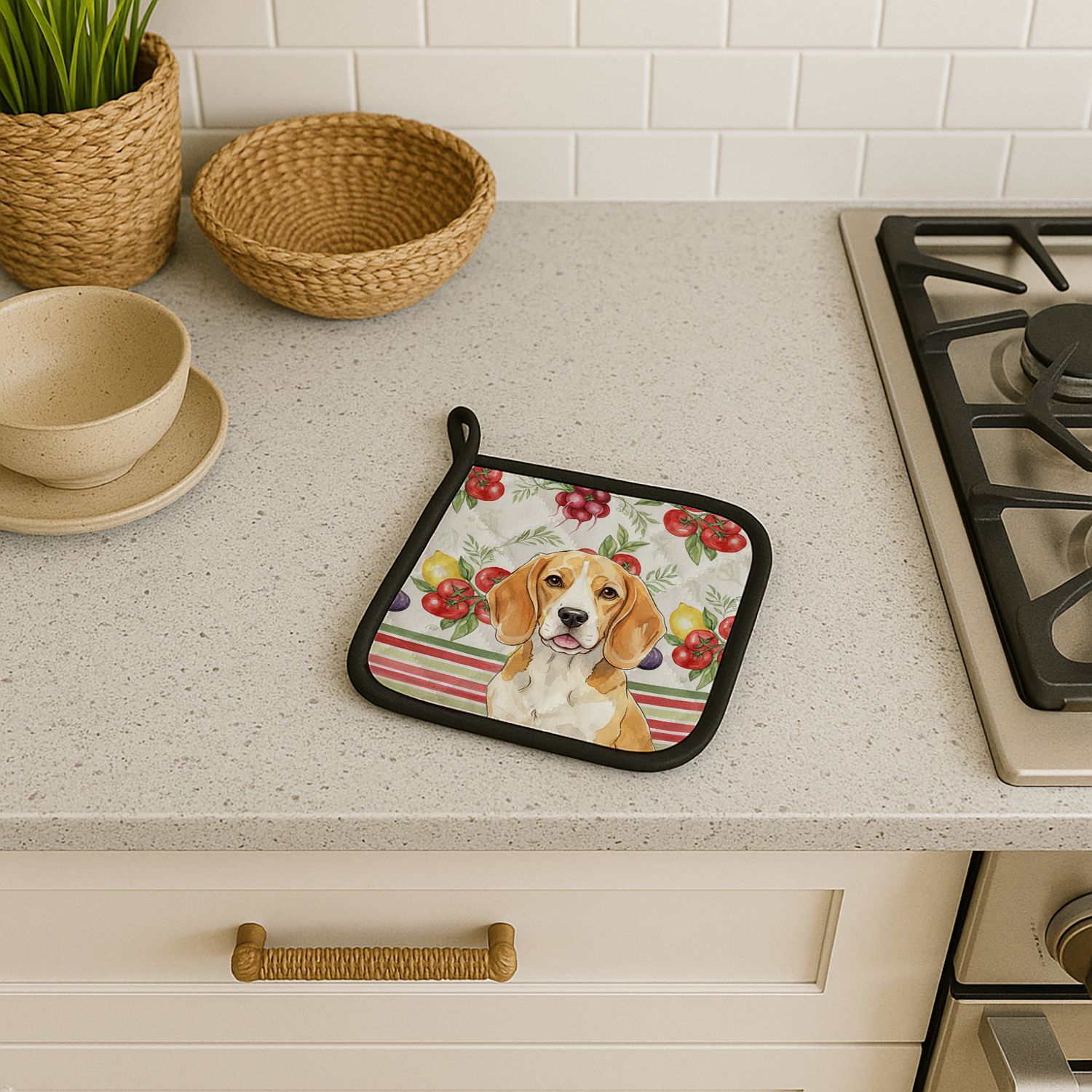 Pair of Pot Holders featuring breed specific Beagle artwork. Add warmth, personality, and function to your kitchen with our Vegetables Pot Holder Pair. Each set includes two quilted hot pads, featuring original full-color watercolor artwork on a soft polyester front accented by black trim. Crafted with multiple layers for performance: Top Layer: Vibrant artwork permanently dyed into polyester fabric. Middle Layer: US-manufactured insulated material with breathable polyester fibers and a reflective metalized film that reflects heat back to its source. Bottom Layer: A silver heat-resistant backing for extra protection. Each pot holder measures 7.5" x 7.5", includes a hanging tab, and is quilted for durability. Use them to protect your hands, countertops, and tabletops — or as decorative trivets for Thanksgiving, Christmas, or everyday meals.